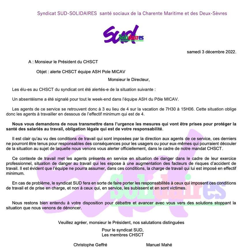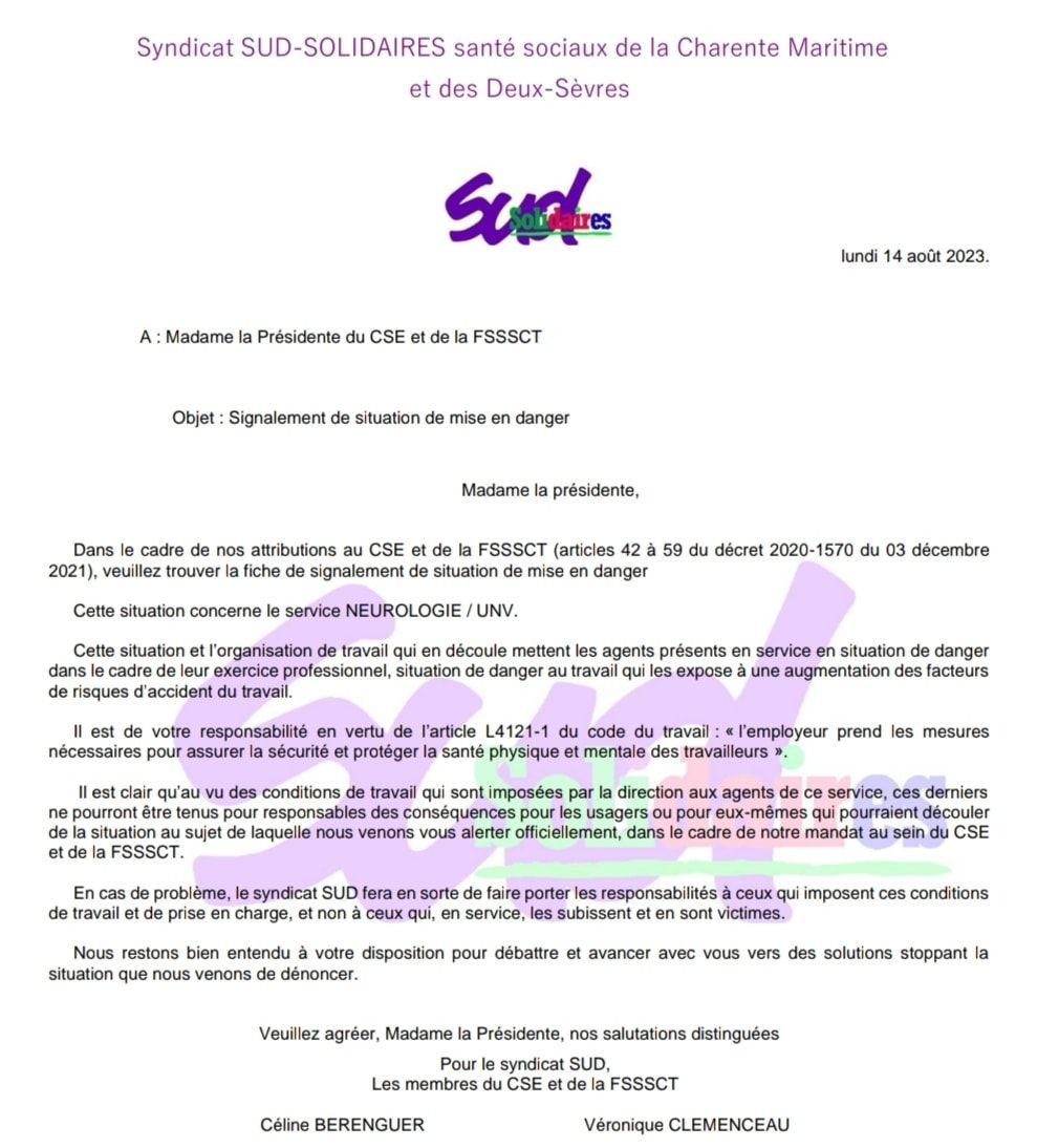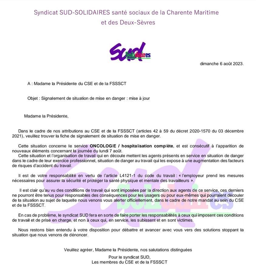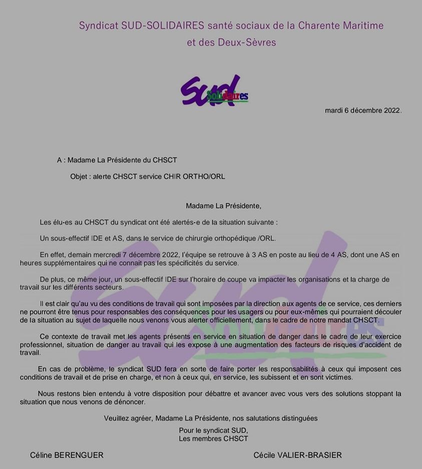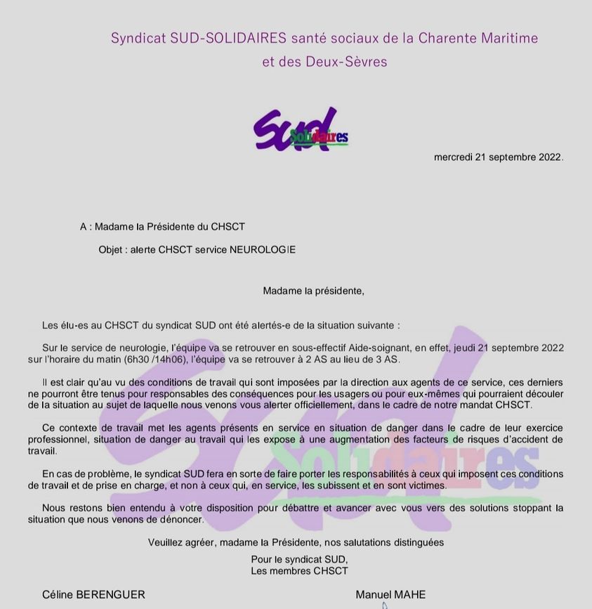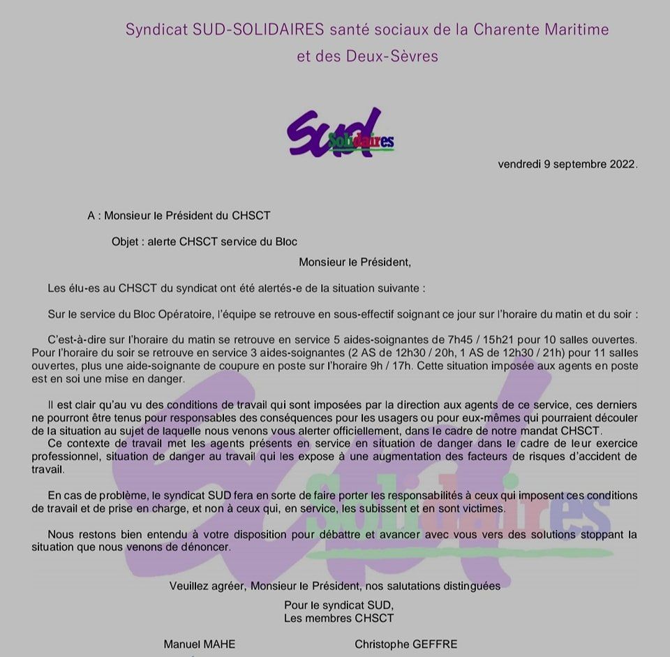 URGENT ON A BESOIN DE VOUS. SUD a déclenché un CHSCT AU GH LA ROCHELLE RE AUNIS