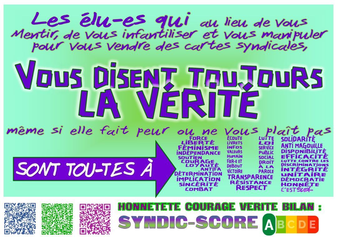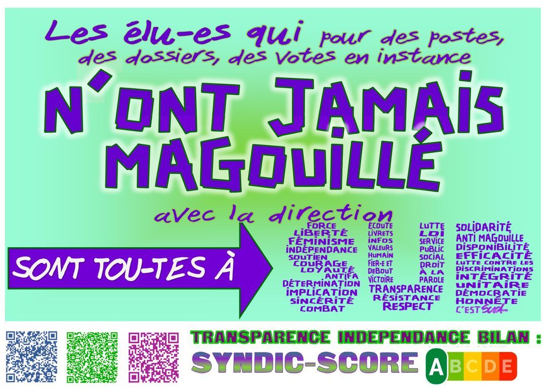 Si vous aussi, vous rencontrez ces problématiques, ou d'autres, n'hésitez pas à nous prévenir. Vous n'êtes pas responsables des conséquences du management institutionnel que vous subissez et qui est de la seule responsabilité de la direction. Vos élue-s SUD sont joignables, comme depuis des années, 24/24h et 7/7j pour sécuriser vos conditions de travail. SUDistez vous