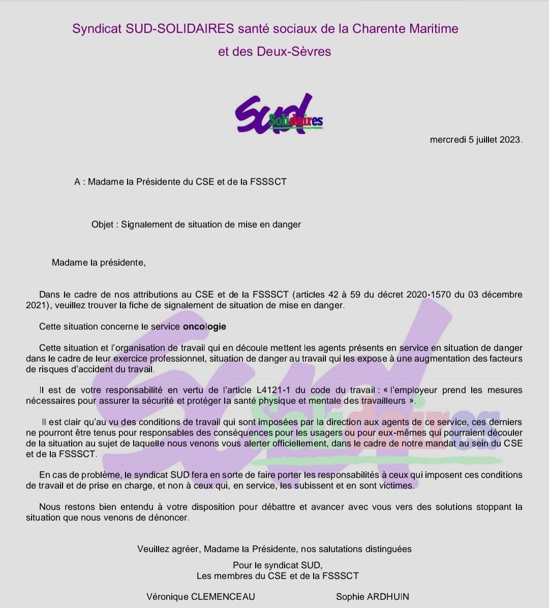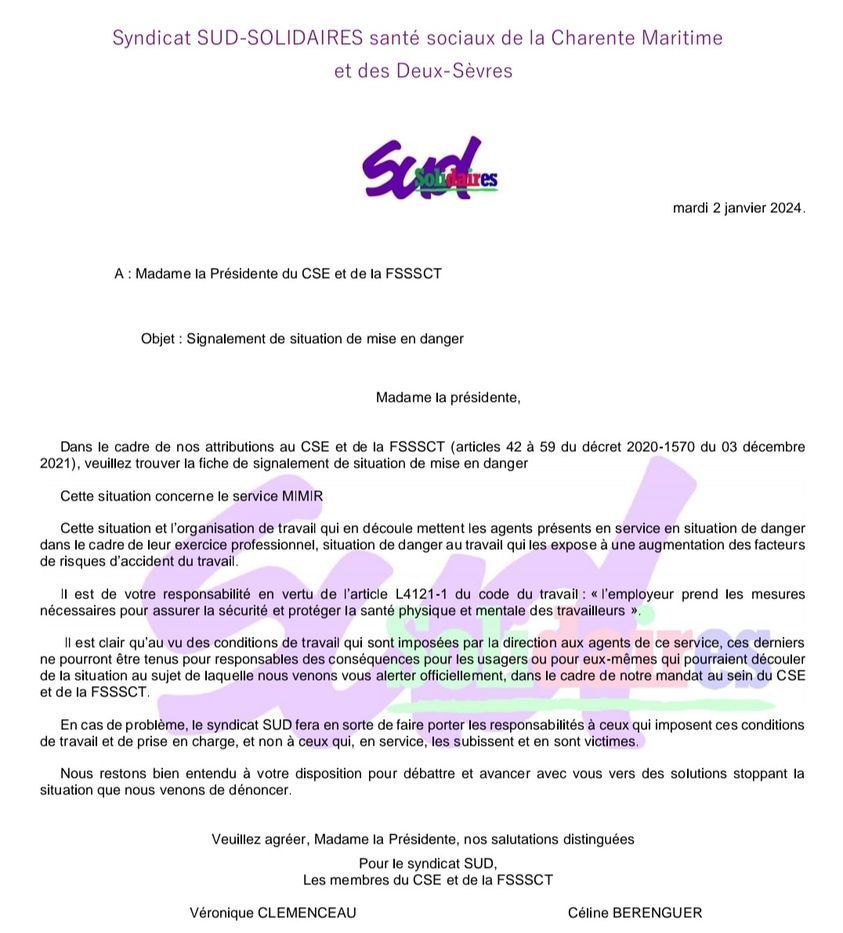 Alerte CHSCT service oléron
