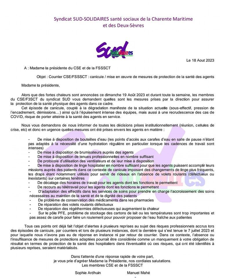 Merci de nous envoyer par mail ou message perso ( ne publiez rien sur Facebook) des images ou vidéo des conditions de chaleur, des dysfonctionnements, du matériel éventuel mis à dispo ou des manques, et de vos problématiques, y compris vis à vis des prises en charge des patients (volets bloqués, températures dans les chambres, etc…)