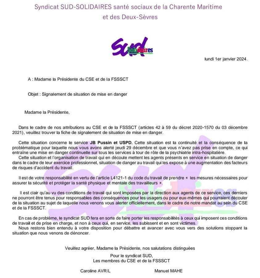Mise en danger toujours, en psychiatrie à La Rochelle. Attention, le saccage de la psychiatrie est en route. Sudistez-vous !