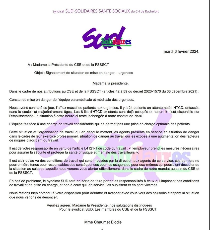 l’hôpital ne peux plus répondre aux besoins de la population. La direction des hôpitaux de l’Aunis déclare des plans blancs illégaux pour masquer les conséquences de sa politique pour l’offre de soins…. Action SUD. C’est pour vous qu’on se bat.